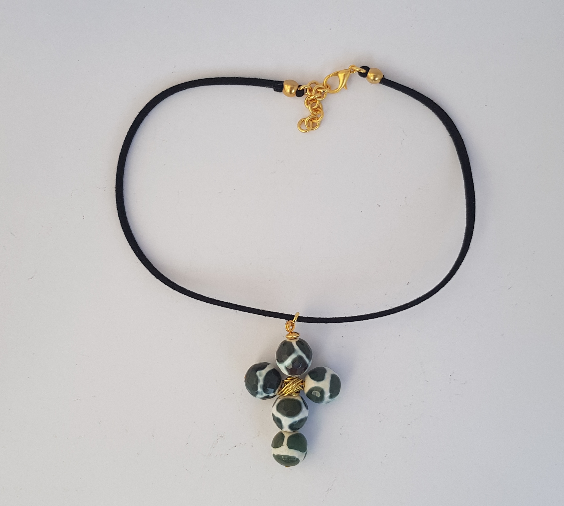 Collar corto de ante negro con cruz de Agatas kaki y blanco de 32 cm aprox. (para que quede pegadito a el cuello)