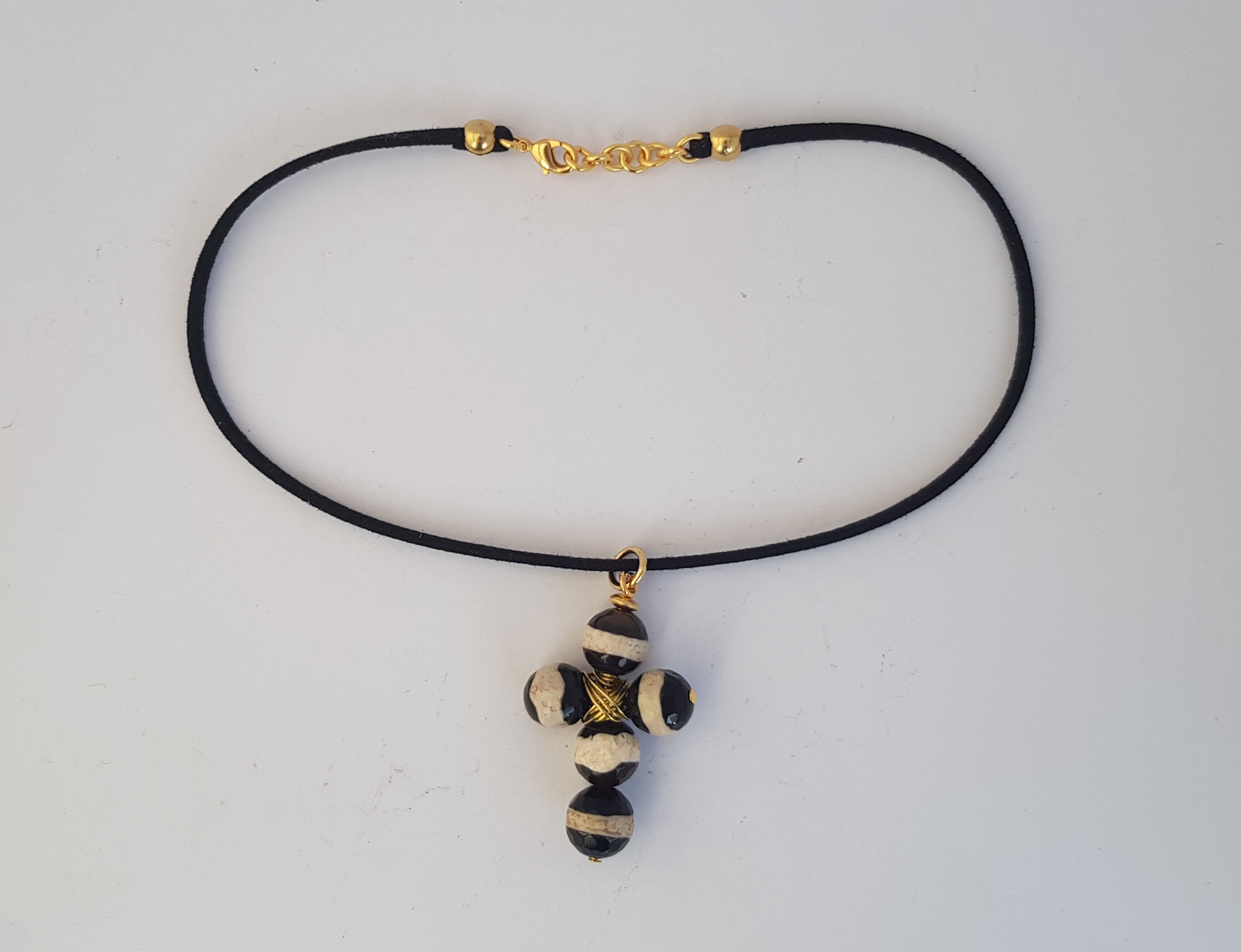 Collar corto de ante negro con agatas de rayas blancas y negras ,de 32 cm aprox, (para que quede pegadito a el cuello)
