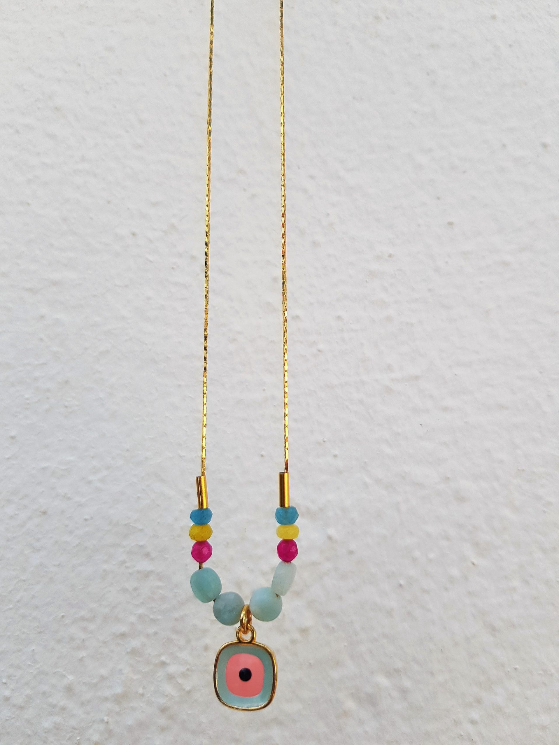 Gargantilla con pieza esmaltas en tonos celestes y ágatas de colores