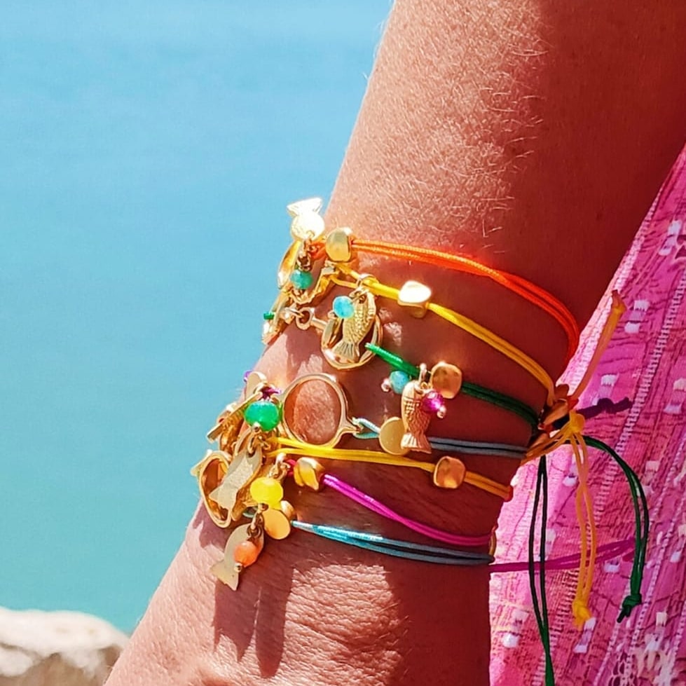 Pulseras bicolor con aro y pez con baño de oro y agatas de colores