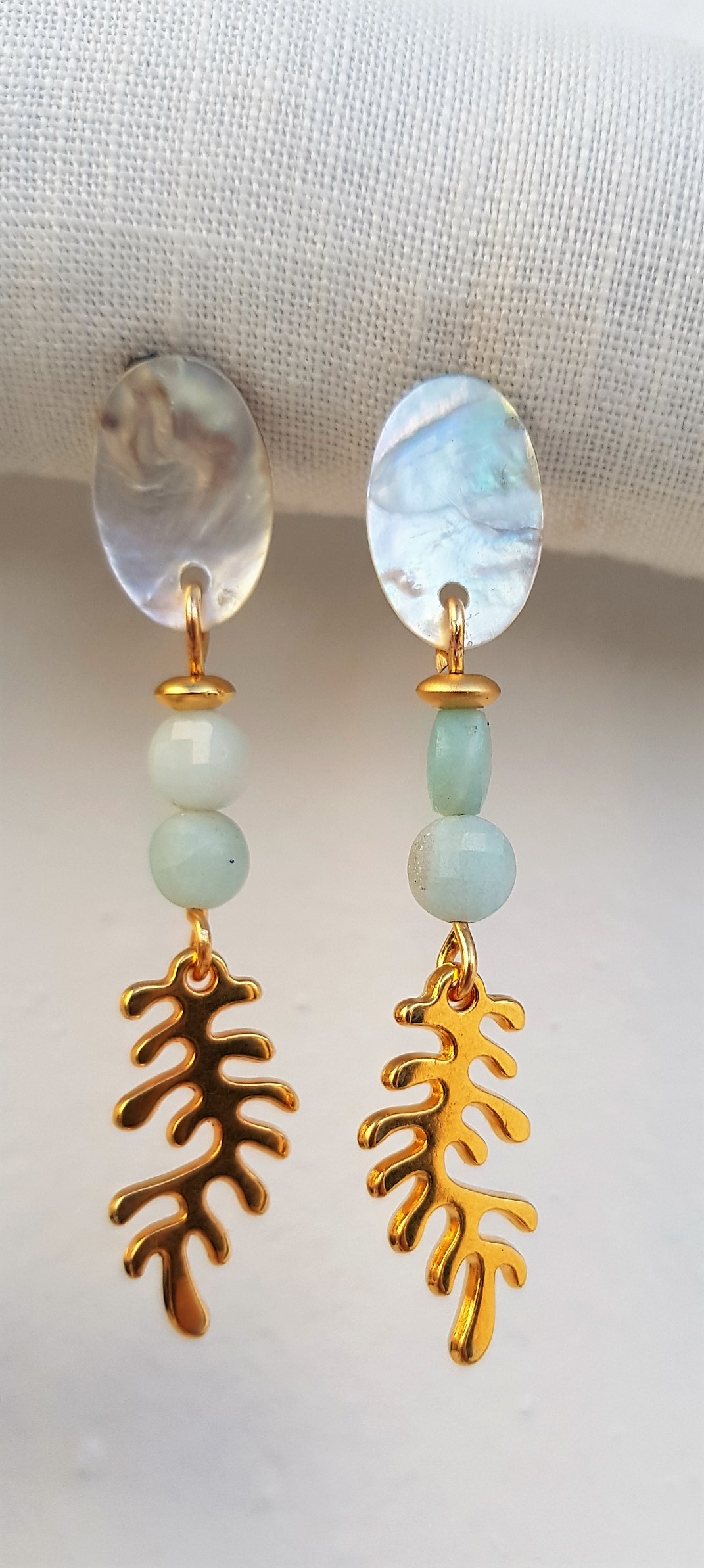 Pendiente con 2 piedras naturales , alga bañada en oro y nácar