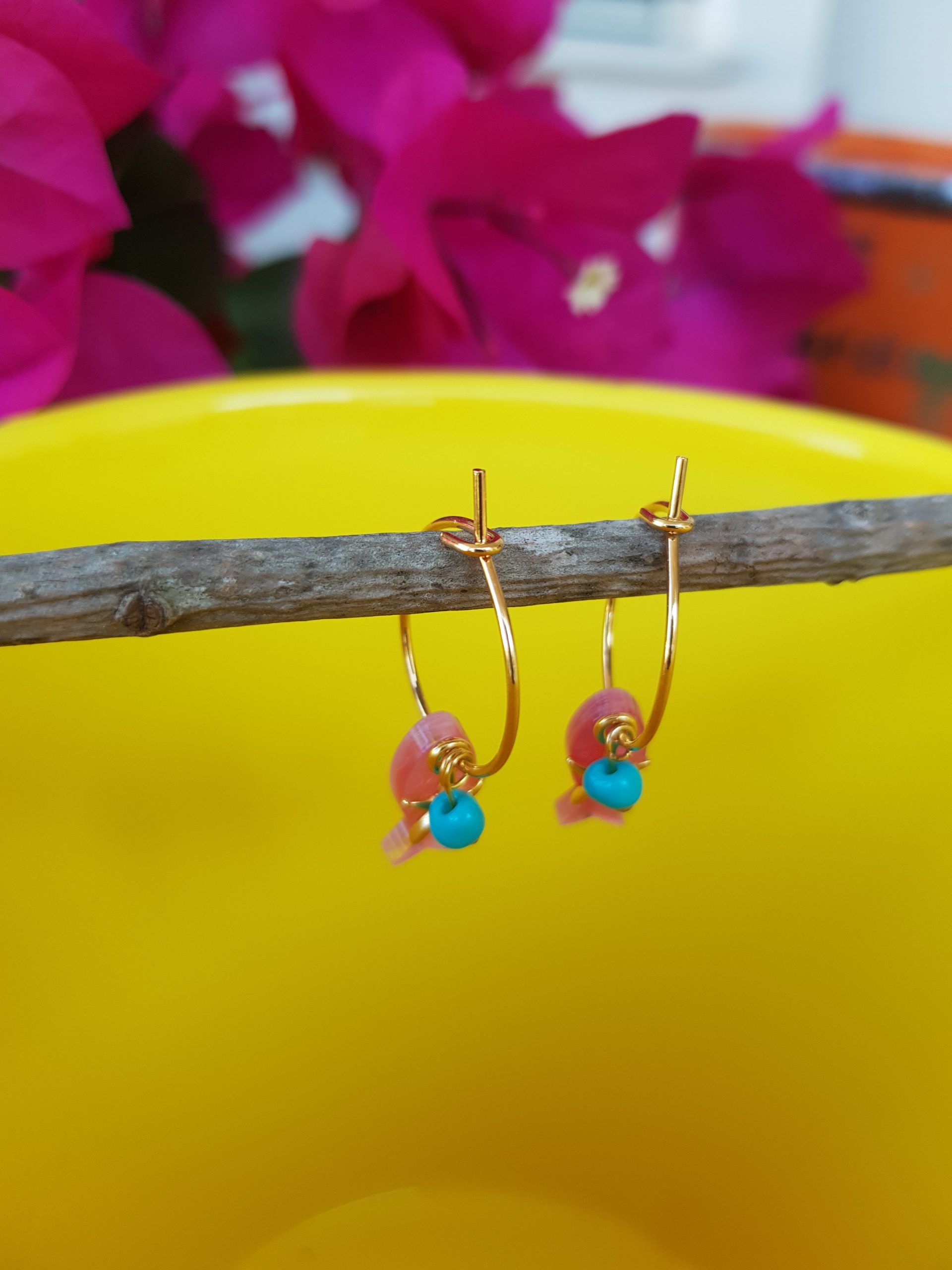 Pendiente con pez esmaltado en rosa con ágatas de colores y arito hipoalérgico