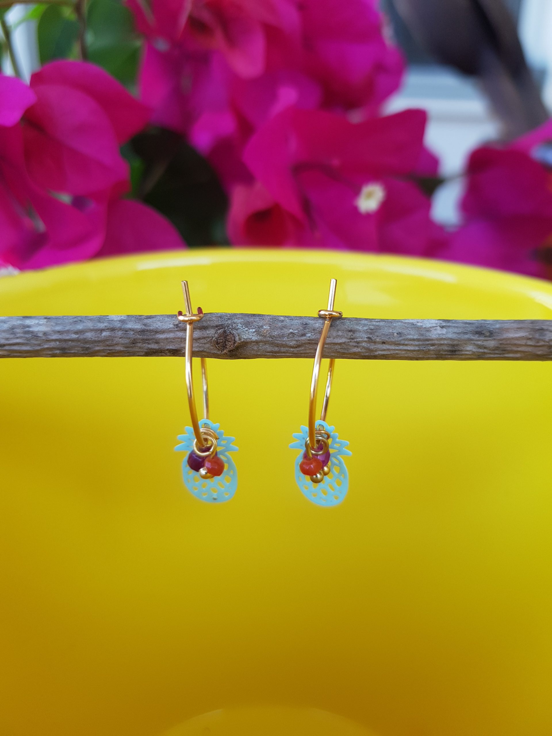 Pendiente con piña de esmaltada en azul con ágatas de colores y arito hipoalérgico