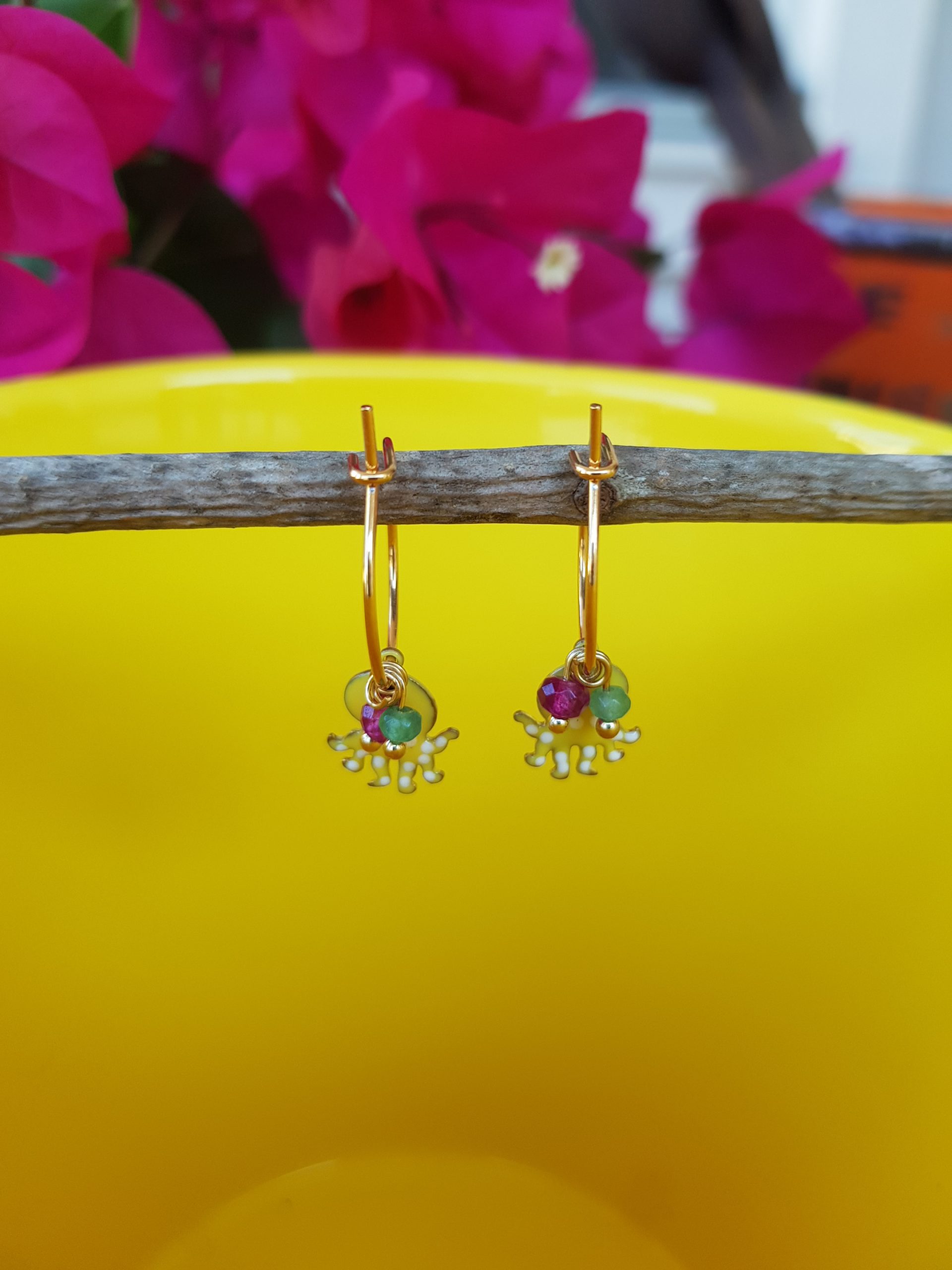 Pendiente con pulpo esmaltado en amarillo y blanco con arito hipoalérgico y ágatas de colores
