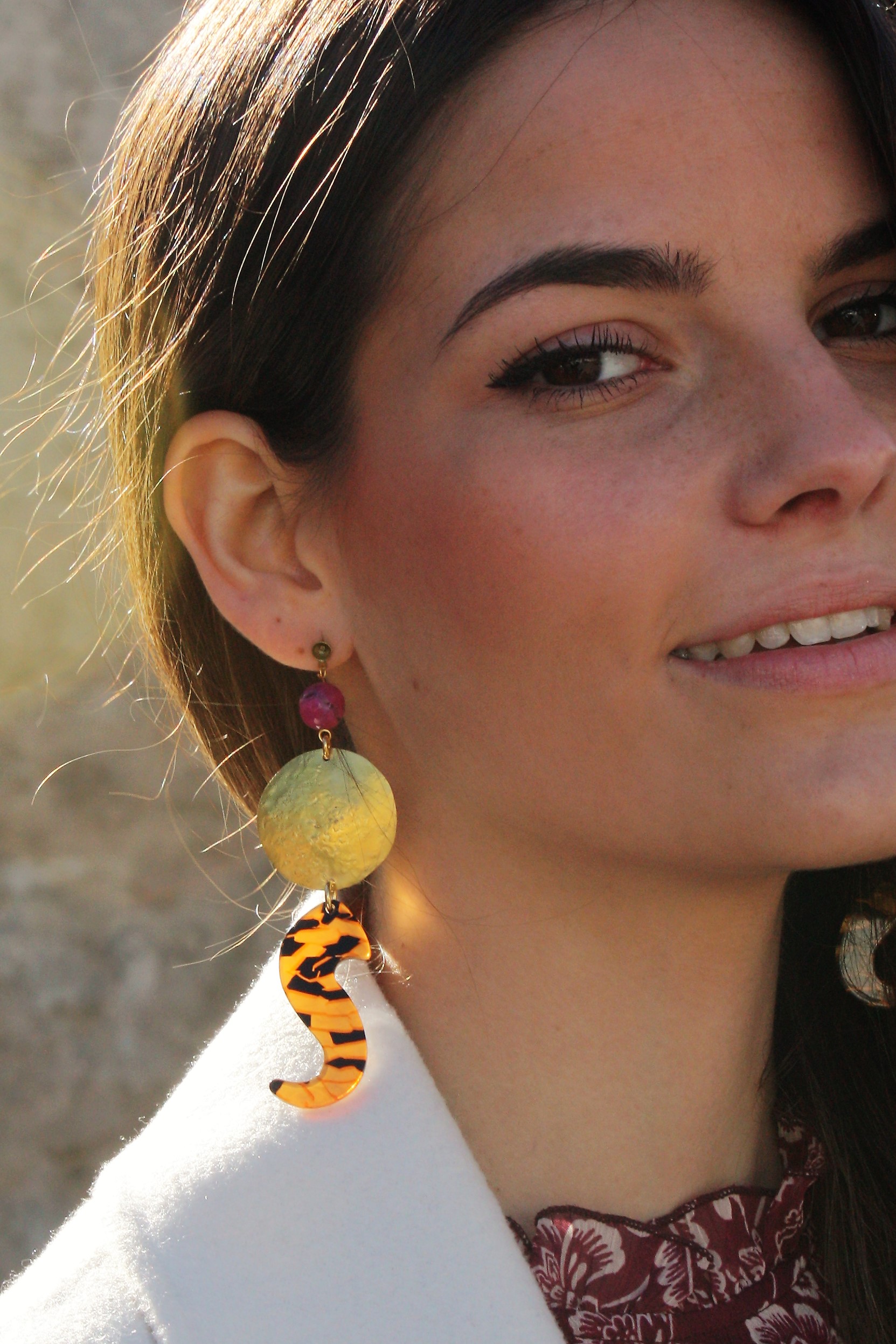 Pendiente con Ágata buganvilla , pieza de latón ( hecha a mano) y pieza de acetado ,ultra ligeros, miden 10 cm de largo x 3 cm de ancho.