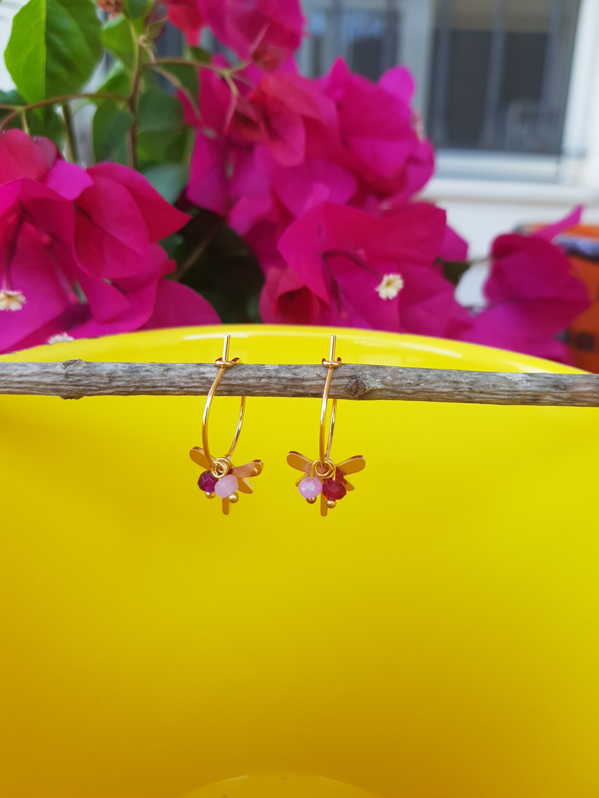 Pendientes de aritos hipoalérgicos con libélulas en baño de oro y ágatas en dos colores