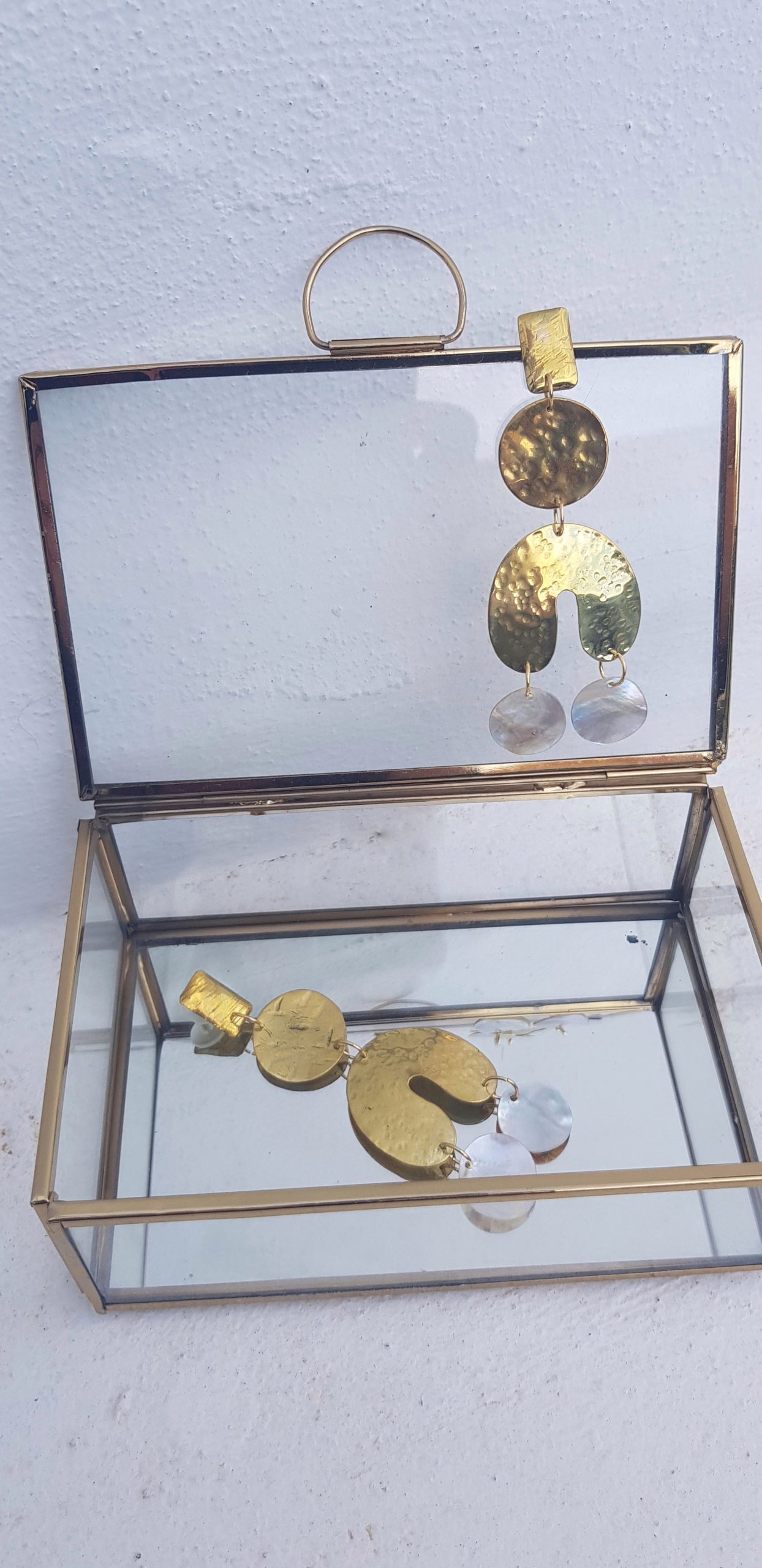 Pendientes realizados en latón y piezas hechas a mano ,con monedas de nacar.