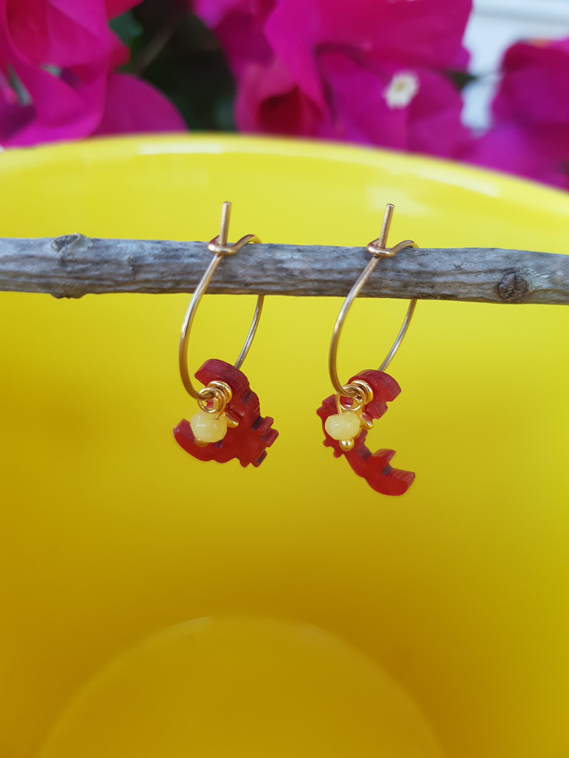 Pendientes con cangrejo realizado en resina con ágatas y crúz bañada en oro, el arito es hipoalérgico