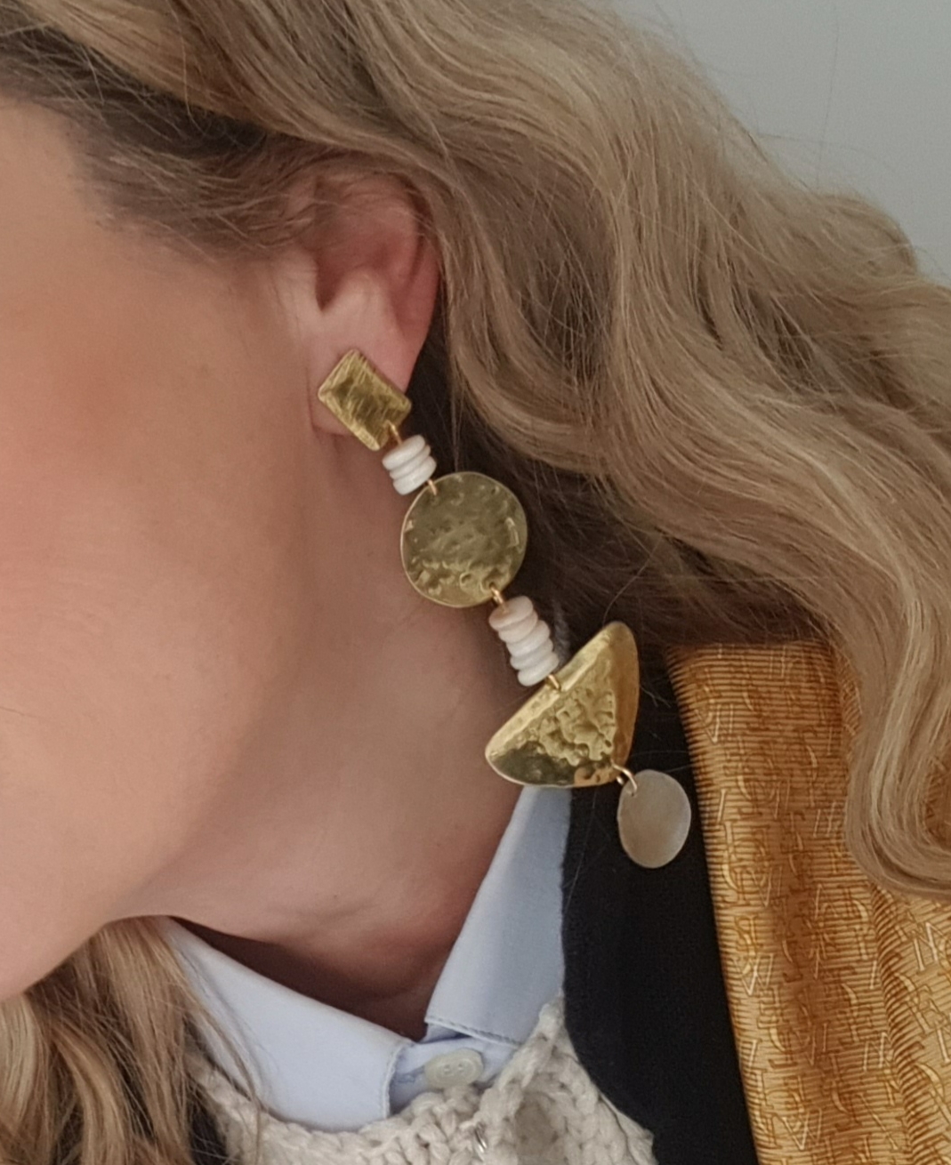 pendientes hechos a mano en latón y nacar ,miden 13 cm de largo.
